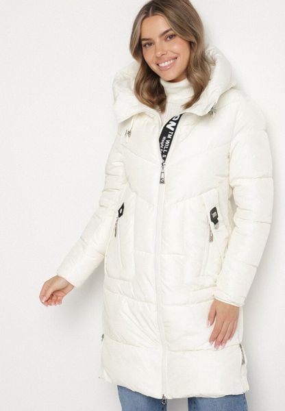 Biała Długa Kurtka Pikowana z Kapturem i Ozdobną Taśmą przy Suwaku Galorrea