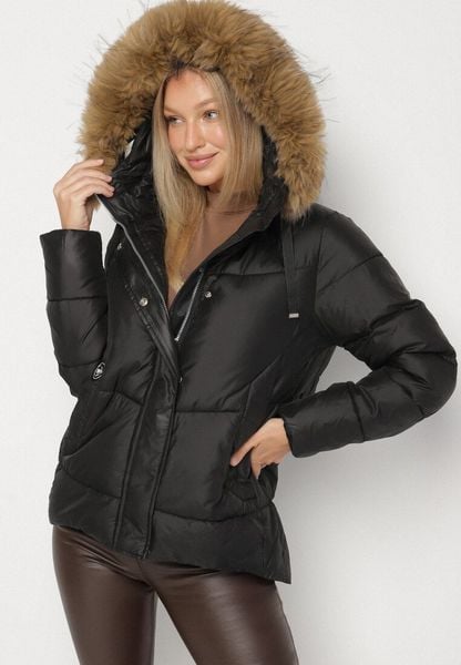 Czarna Pikowana Kurtka o Trapezowym Kroju z Kapturem z Futrem Lanarela