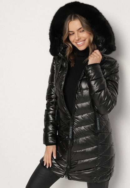 Czarna Pikowana Kurtka o Taliowanym Kroju z Kapturem z Futerkiem Naleanna