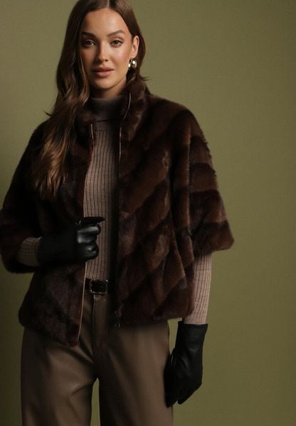Brązowa Kurtka Futerko o Trapezowym Kroju z Rękawem 3/4 Tadeira