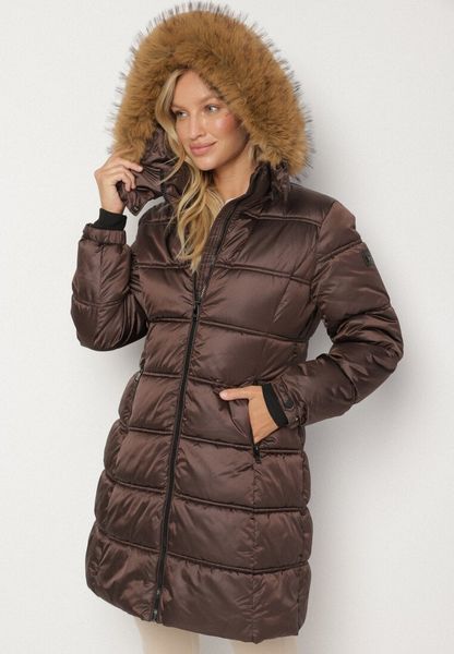 Ciemnobrązowa Długa Kurtka Pikowana z Kapturem z Futrem z Możliwością Odpięcia Feneia