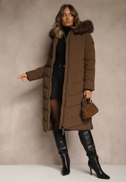 Brązowa Pikowana Kurtka o Długim Kroju z Kapturem z Futrem Galianesa