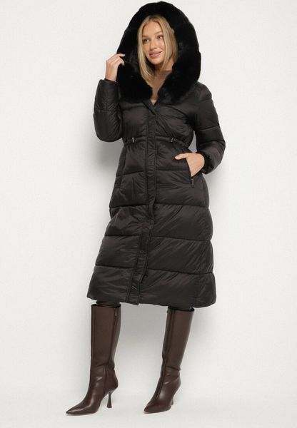 Czarna Długa Kurtka Puchowa z Pikowanymi Przeszyciami i Kapturem z Futrem Zevea