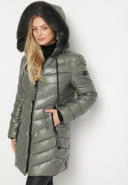 Zielona Pikowana Kurtka z Kapturem z Futerkiem Zorria