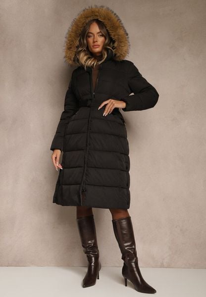 Czarna Pikowana Kurtka o Długim Kroju z Paskiem i Kapturem z Futrem Aveslia