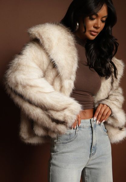 Beżowo-Biała Futrzana Kurtka z Efektowym Kołnierzem Tulesea