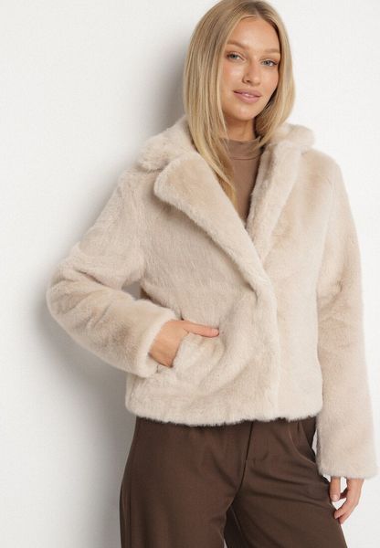 Beżowa Krótka Kurtka Futerko z Kołnierzem w Eleganckim Stylu Giriselle