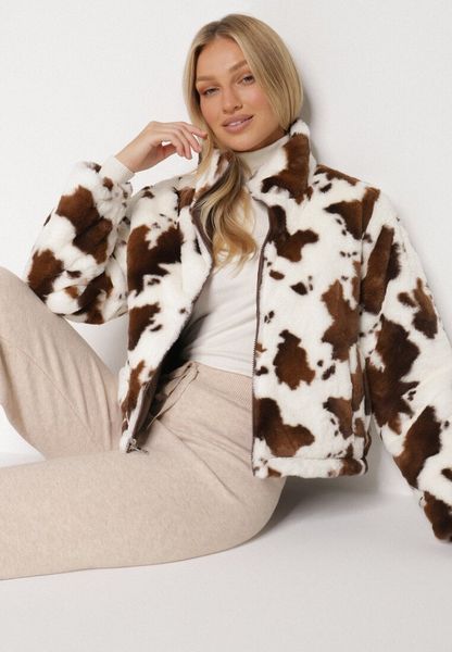 Brązowa Dwustronna Pikowana Kurtka z Futerkiem w Łaty Meviatella