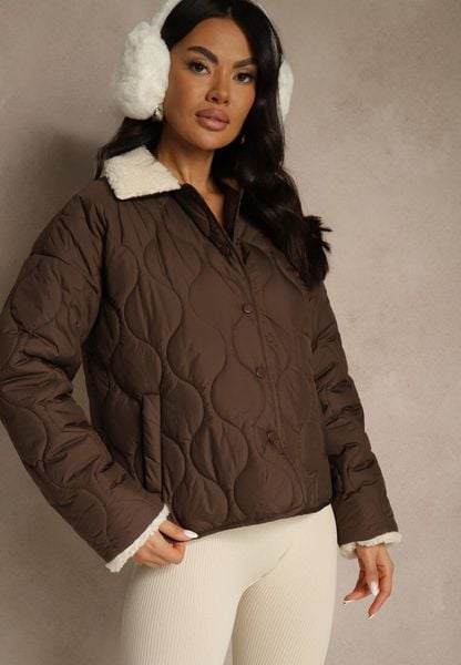Brązowa Pikowana Kurtka o Koszulowym Kroju z Futrzanym Kołnierzem Selme