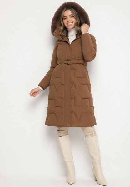 Brązowa Długa Kurtka Zimowa z Geometrycznym Pikowaniem Paskiem i Kapturem Emiltia