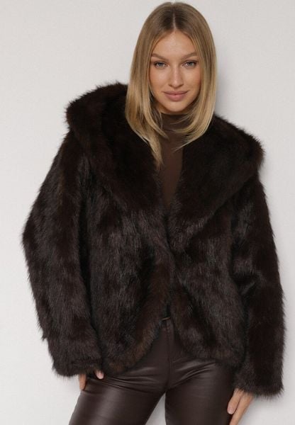 Brązowa Kurtka Futerko z Kapturem i Szerokim Kołnierzem Nalafera