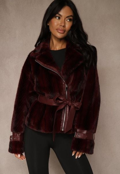 Bordowa Kurtka Futerko z Paskiem z Imitacji Skóry Zdobiona Klamerkami Jynlisa