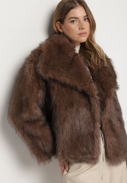 Brązowa Jednorzędowa Kurtka Futerko z Szerokim Kołnierzem Conellia