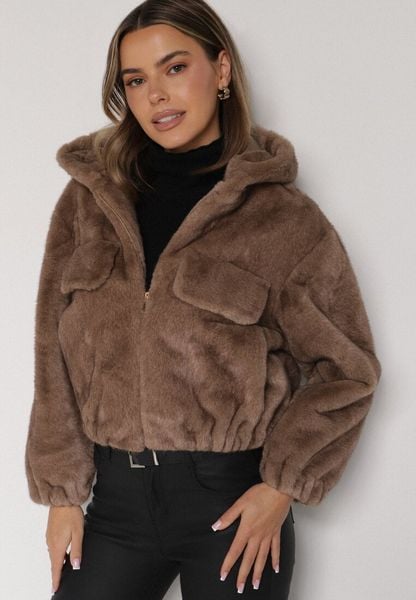 Jasnobrązowa Futrzana Kurtka Bomberka z Kapturem i Ozdobną Imitacją Kieszeni Awedalia