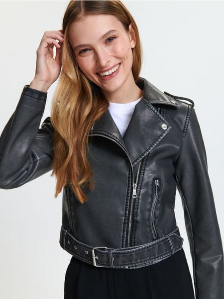 Kurtka ramoneska o krótszym kroju, wykonana z imitacji skóry z ozdobnymi przetarciami.