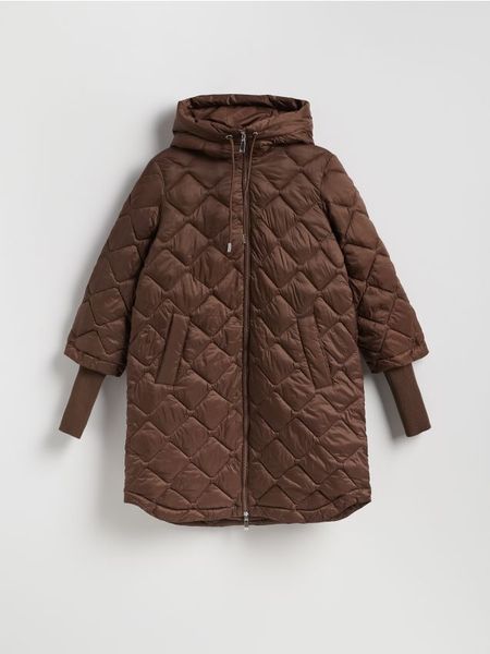 Kurtka o dłuższym kroju, wykonana z pikowanej tkaniny z ociepleniem.