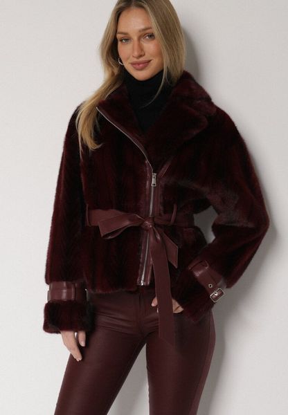 Bordowa Futrzana Kurtka z Paskiem z Imitacji Skóry i Ozdobnymi Sprzączkami Oryss