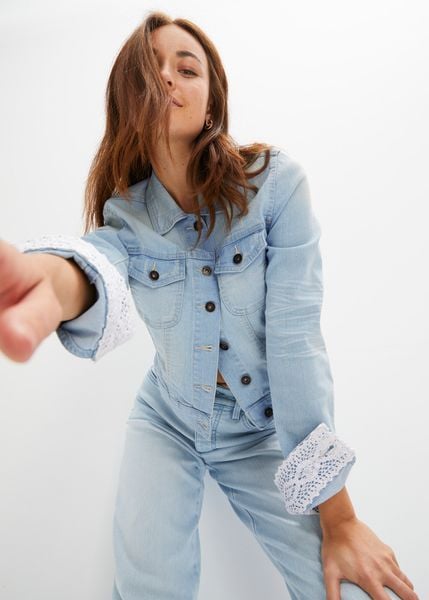 Krótka kurtka dżinsowa z koronkowymi wstawkami. Krótki fason, z koronkową wstawką po wewnętrznej stronie mankietów. Dł. w rozm. 38 ok. 49 cm.
