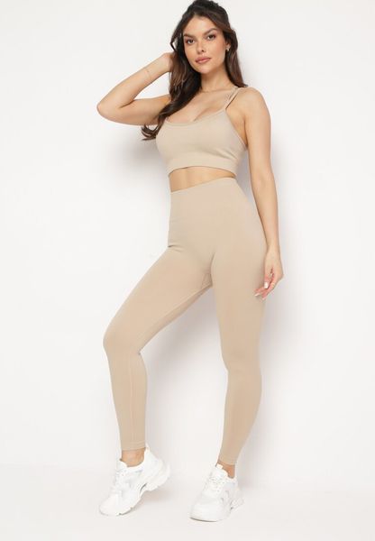 Beżowy Komplet Sportowy Biustonosz na Ramiączkach i Legginsy z Gumką w Pasie Nadlira