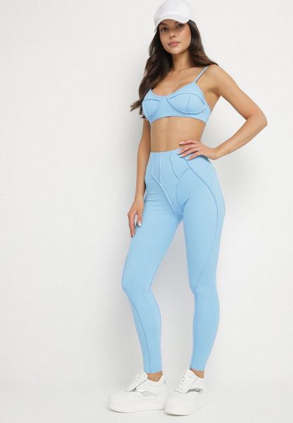 Jasnoniebieski Komplet Sportowy z Ozdobnymi Przeszyciami Legginsy i Top na Ramiączkach Filinella