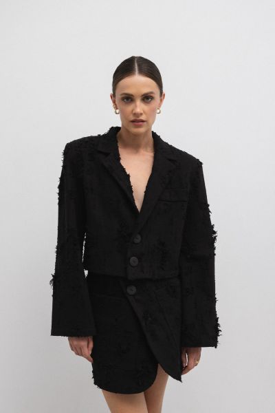 Krótka marynarka z surowej tkaniny w kolorze CZARNYM – UNIQUE-S/M