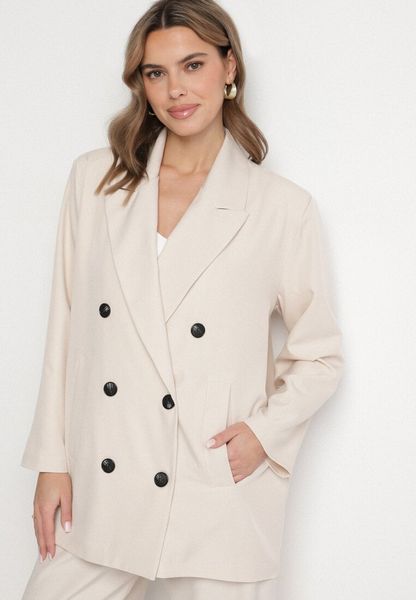 Jasnobeżowa Dwurzędowa Marynarka o Pudełkowym Kroju Oversize z Dodatkowym Guzikiem Paselira