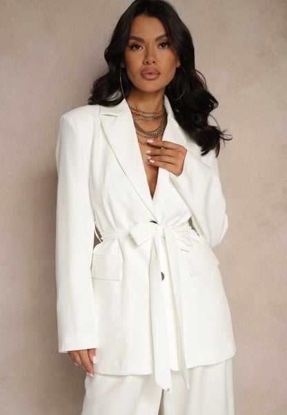 Biała Jednorzędowa Marynarka z Paskiem i Usztywnionymi Ramionami Diomella