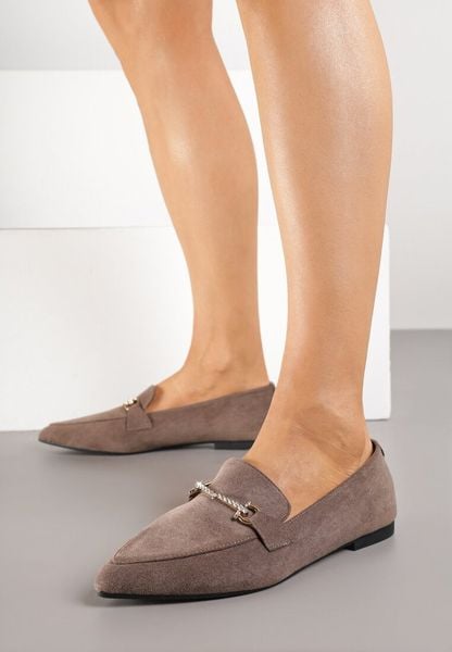 Ciemnobeżowe Mokasyny Vices ze Szpiczastym Noskiem Zdobione Aplikacją Rilosia