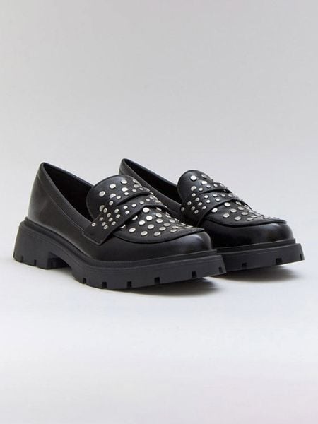 – zapięcie: bez- noski: zaokrąglone- noski i zapiętki: wzmocnione- detale: ozdobne nity i pasek- forma obcasa: blokowy- podeszwa: antypoślizgowa