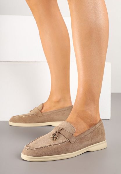 Ciemnobeżowe Mokasyny z Imitacji Zamszu z Ozdobną Aplikacją Tasseli