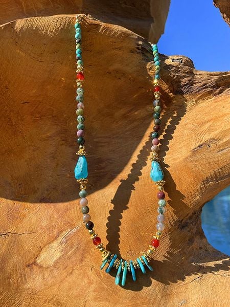 – materiał: mosiądz- powłoka: w kolorze złota- zapięcie: karabińczyk- rodzaj kamienia 1: turkus- rodzaj kamienia 2: agat- rodzaj kamienia 3: onyks- kolor kamieni: wielokolorowy- regulacja długości: takWskazówka: Zdjęcie produktu w powiększeniu.