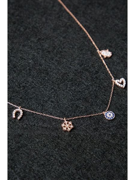 – materiał: srebro Sterling próby 925- powłoka 1: rodowana- powłoka 2: w kolorze różowego złota- typ łańcuszka: ankier- zapięcie: karabińczyk- rodzaj kamienia: cyrkonia- kolor kamienia: biały, niebieskiWskazówka: Zdjęcie produktu w powiększeniu.