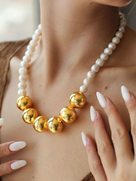 – materiał: mosiądz- powłoka: złoto- zapięcie: karabińczyk- rodzaj perły: hodowlana – słodkowodna- kolor pereł: biały- regulacja długości: takWskazówka: Zdjęcie produktu w powiększeniu.