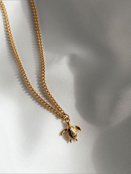 – materiał: stal szlachetna- powłoka: w kolorze złota- zapięcie: karabińczyk- kształt zawieszki: żółw- regulacja długości: takWskazówka: Zdjęcie produktu w powiększeniu.