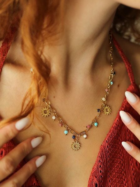 – materiał: stal szlachetna- powłoka: złoto- zapięcie: karabińczyk- rodzaj kamienia: kamień ozdobny- kolor kamienia: wielokolorowy- regulacja długości: takWskazówka: Zdjęcie produktu w powiększeniu.