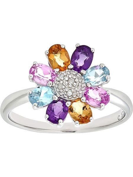 – materiał: 9-karatowe białe złoto próby 375- kamień 1: diament- kolor kamienia: bezbarwny (I-J)- czystość: I1- liczba karatów: 0,03- kamień 2: ametyst- kamień 3: szafir- kamień 4: topaz- kamień 5: cytryn- kolor kamienia: pomarańczowy, fioletowy, jasnoróżowym i niebieskiUwaga: Zdjęcie produktu w powiększeniu.