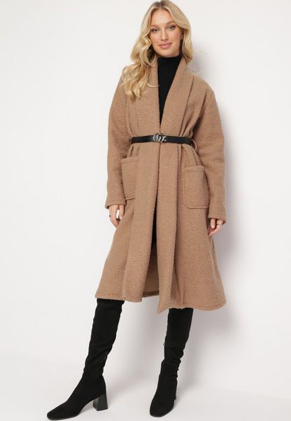 Beżowy Długi Płaszcz Niezapinany z Paskiem Magina