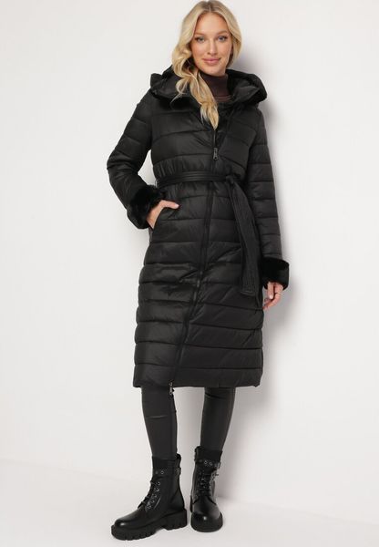 Czarna Kurtka Pikowana Płaszcz za Kolano z Odpinanym Kapturem i Sztucznym Futerkiem Ascendia
