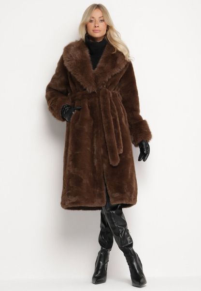 Brązowy Futerkowy Płaszcz z Szerokim Kołnierzem i Mankietami z Wiązanym Paskiem Viaruna