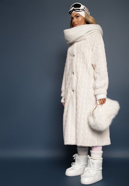 Jasnobeżowy Oversizowy Płaszcz o Jednorzędowym Kroju z Kieszeniami i Wzorzystym Splotem Hennara