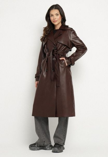 Bordowy Dwurzędowy Płaszcz Trencz z Wiązanym Paskiem z Imitacji Skóry Davivaya