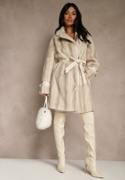 Jasnobeżowy Płaszcz Futerko z Paskiem z Imitacji Skóry i Klamrami przy Mankietach Charysha