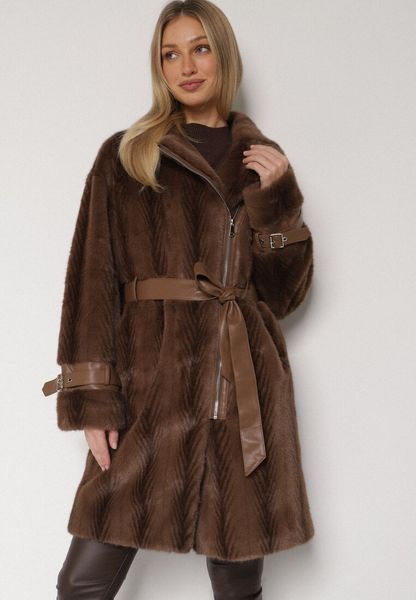 Brązowy Futrzany Płaszcz z Wiązanym Paskiem i Ozdobnymi Sprzączkami Felryna