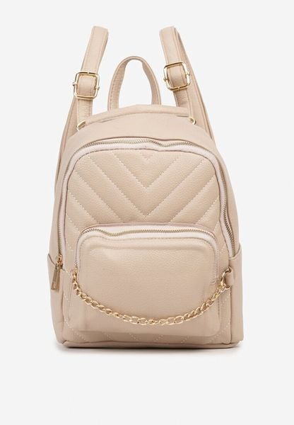 Beżowy Pikowany Plecak z Dodatkową Kieszonką i Łańcuszkiem Joragia