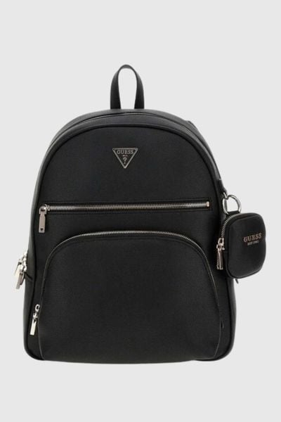 Czarny damski plecak Power Play, marki Guess, wykonany ze skóry ekologicznej. Posiada jedną dużą komorę zamykaną na zamek, oraz trzy kieszenie w środku: dwie wsuwane, jedna zasuwana na zamek. Na zewnątrz znajdują się dwie kieszenie zasuwane na zamek. Plecak posiada nóżki ochronne, w zestawie worek przeciwkurzowy.