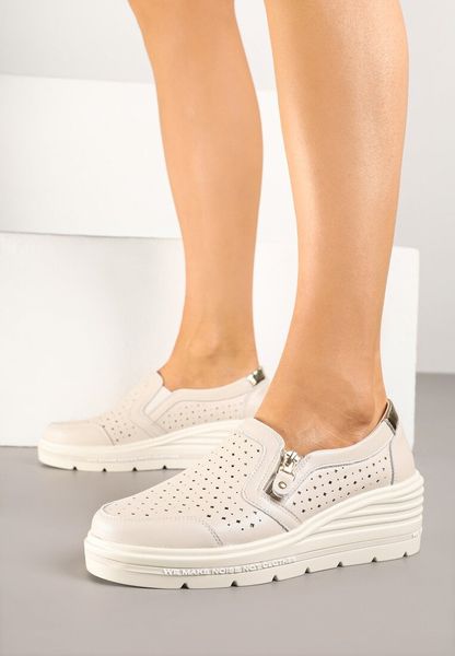Beżowe Półbuty Skórzane na Koturnie z Ozdobnym Suwakiem i Perforacją Odelessa