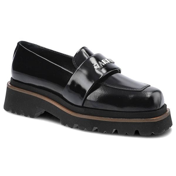 Półbuty damskie Carinii, skóra naturalna lakierowana z ozdobnym pasem i srebrnym metalowym napisem na grubej płaskiej podeszwie, czarne, B7626_-037-0