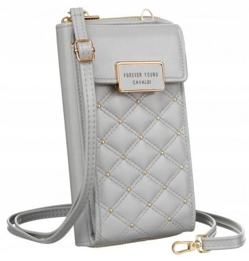 Torebko-portfel w fasonie piórnika zapinany na zamek. Na froncie kieszonka na telefon zapinana klapką na zatrzask magnetyczny. Wewnątrz 4 miejsca na karty i 1 kieszonka na suwak. Posiada odpinany, regulowany pasek. Elegancki, pikowany panel na froncie.