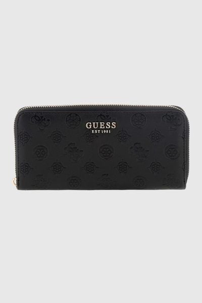 Czarny damski portfel ze skóry ekologicznej marki Guess. Zamykany na zamek, wewnątrz zasuwana kieszeń na bilon, dwie przegrody, 12 miejsc na karty, dwie wsuwane kieszenie i dodatkowa kieszeń na zamek z tyłu.