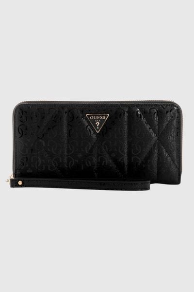 Czarny portfel damski marki Guess, wykonany ze skóry ekologicznej. Zamykany na zamek, posiada wewnętrzną kieszeń na bilon, dwie przegrody, 12 miejsc na karty, dwie kieszenie wsuwane i zamykaną na zamek kieszeń z tyłu.